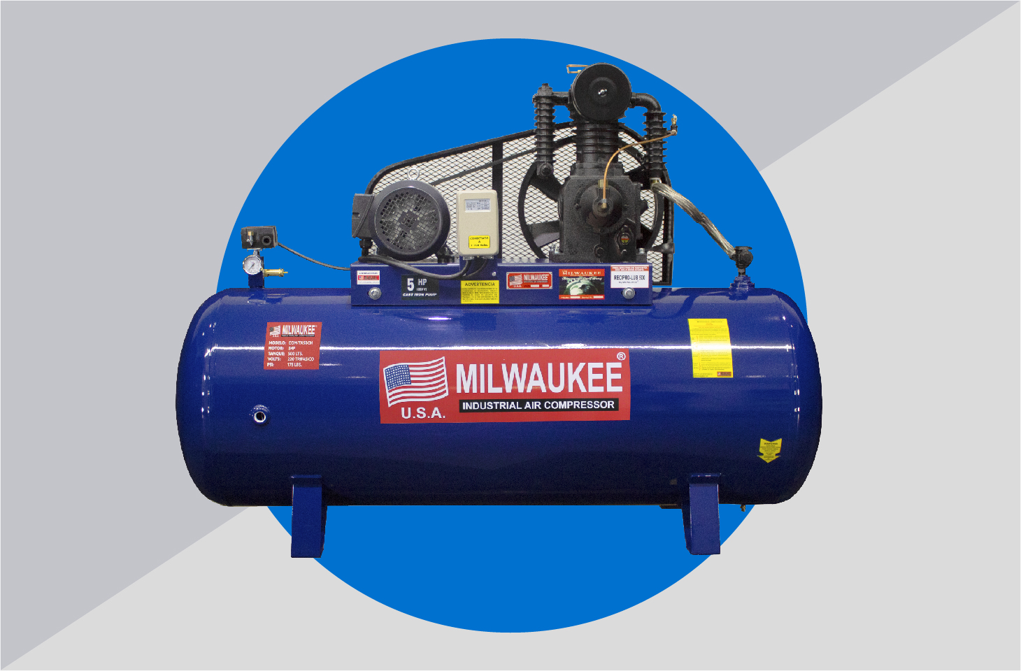 COMPRESOR DE 5 CABALLOS DE FUERZA MONTADO EN UN TANQUE DE 500 LITROS DE CAPACIDAD, 220V / 2 FASES, CFM 22, PRESIÓN MÁXIMA 175 PSI