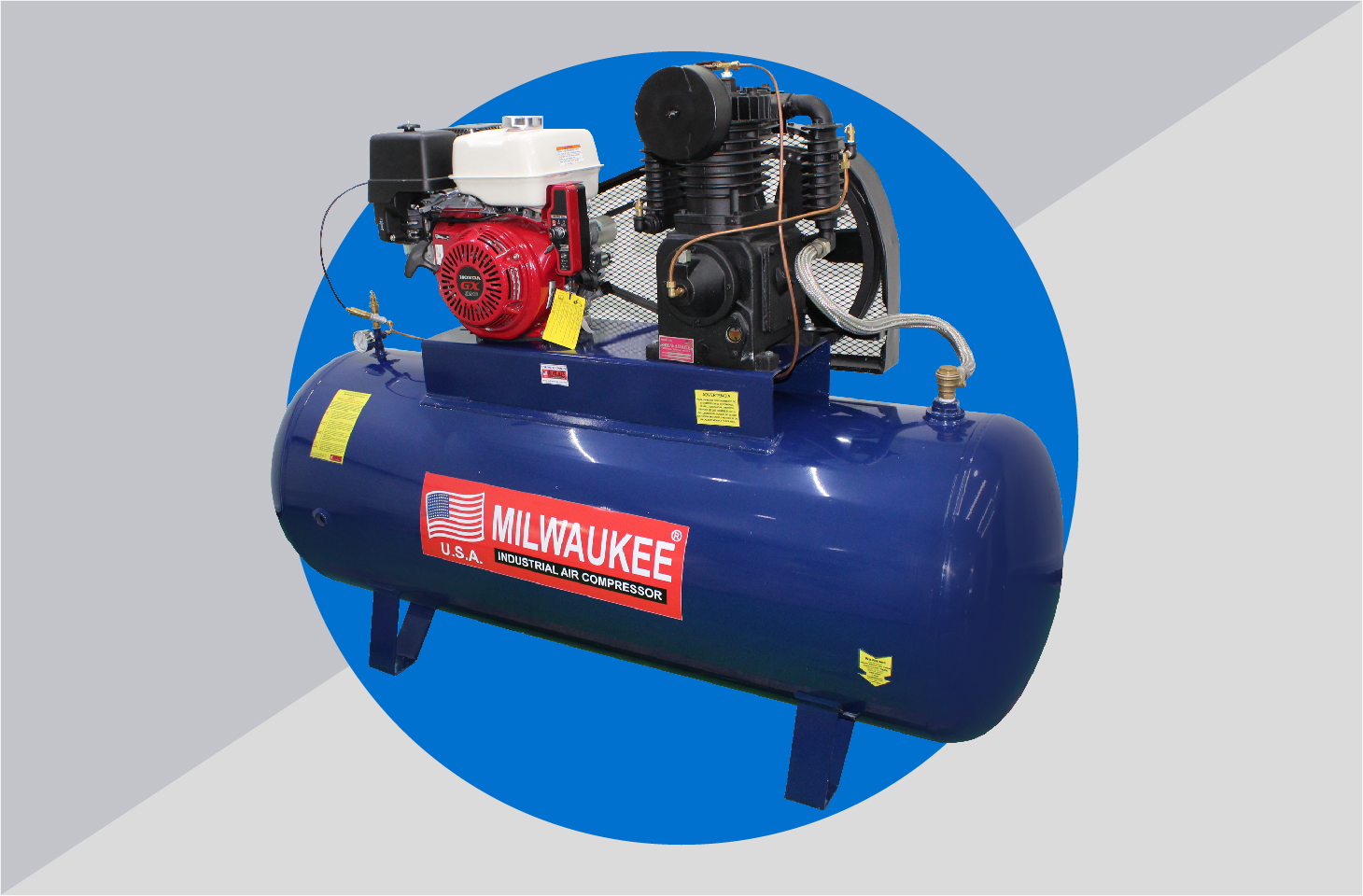 Compresor de arranque eléctrico con un tanque de 130 galones, tiene un CFM de 22 y una potencia de 13 caballos de fuerza, una presión máxima de 175 PSI.