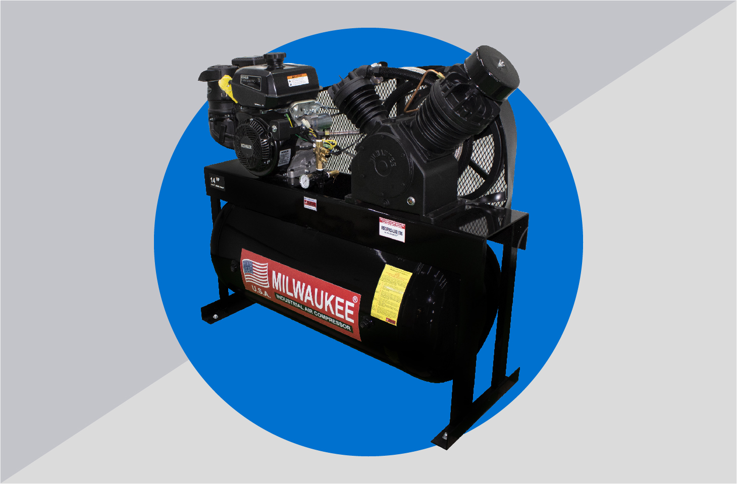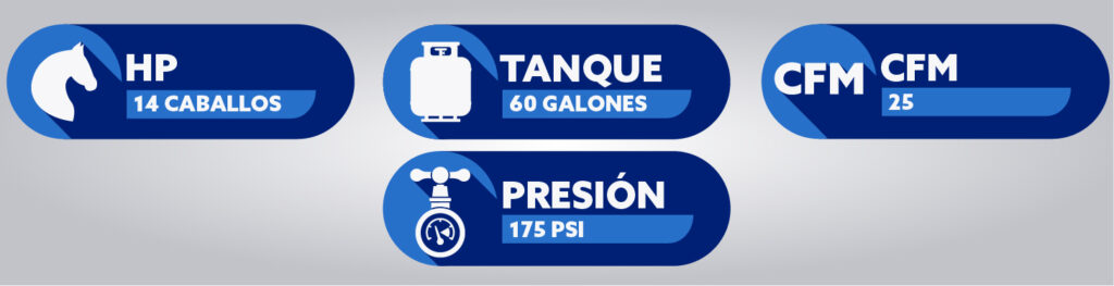 Compresor a gasolina de 14 caballos de fuerza en tanque horizontal de 60 galones (235 litros) el cual soporta una presion maxima de 175 PSI, de arranque manual con motor kohler , CFM 25